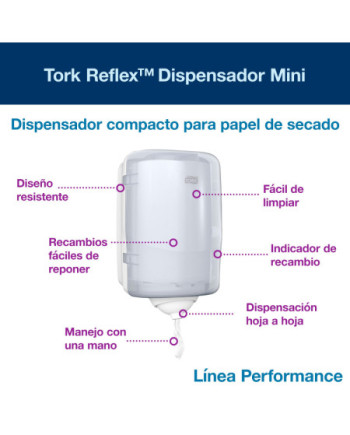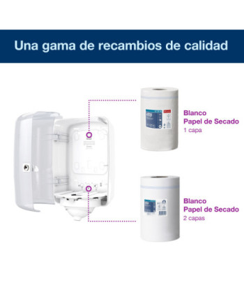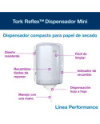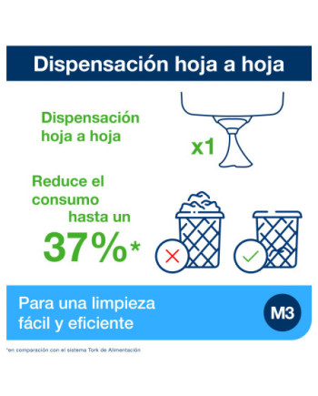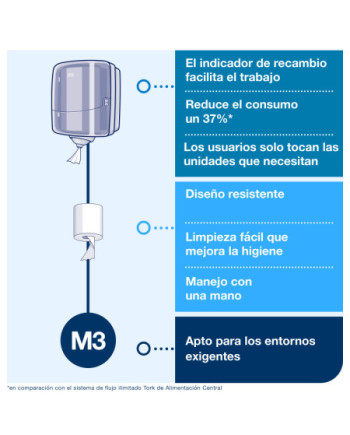 Resumen de ventajas: + Fácil de limpiar para mejorar la higiene general + Menor riesgo de contaminación cruzada: los usuarios solo tocan el papel que usan + Diseño duradero y compacto para ahorrar espacio + Dispensador económico hoja a hoja + Indicador Tork de recambio para una reposición eficiente