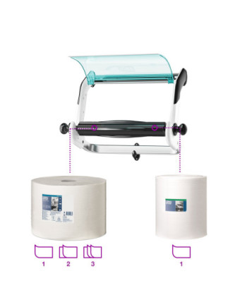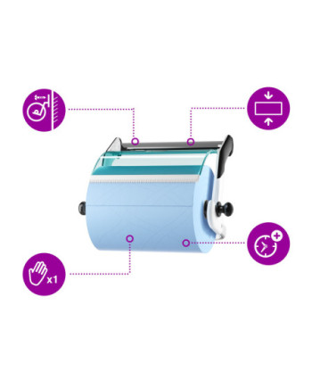 Requiere poco mantenimiento gracias a su gran capacidad y fácil reposición Dispensador de pared que ayuda a organizar espacios de trabajo de dimensiones reducidas Diseño: Performance. W 27.4cm. H 46.3cm. D 64.6cm. Material: Metal/Plástico. Color: Blanco/turquesa. Apto para W1 recambios de Tork.
