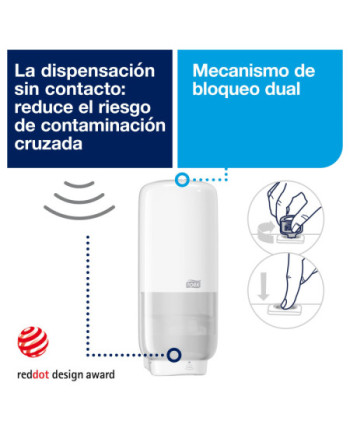 Tork Dispensador para el Cuidado de la Piel con Sensor Intuition™ Blanco S4: Causa una buena impresión a los usuarios con este moderno y práctico dispensador con sensor de la línea Elevation. Al poder usarse con cualquier jabón, desinfectante o crema en botellas selladas de la marca Tork, resulta muy versátil. Este dispensador automático garantiza una correcta higiene de manos a cualquier usuario gracias al diseño certificado como fácil de usar y al suministro sin contacto.