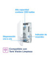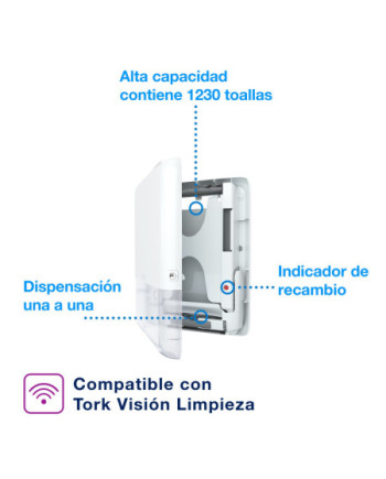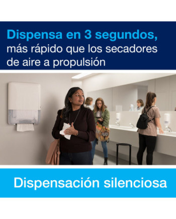 Resumen de ventajas: + Alta capacidad para 1230 toallas + Ideal para baños concurridos y con gran frecuencia de uso + Dispensación continua y fácil en solo 3 segundos + Diseño extrafino para reducir espacio + Conforme a la ley ADA (Ley para Estadounidenses con Discapacidades) + Recargas comprimidas al 50 % para reducir espacio de almacenamiento