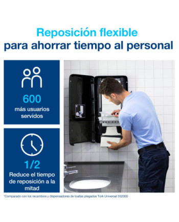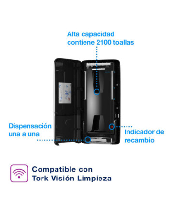 Resumen de ventajas: + Un 250 % más de capacidad para 2100 toallas + Ideal para baños concurridos y con frecuencia máxima de usuarios + Dispensación rápida y fácil en solo tres segundos + Paquetes comprimidos para ahorrar espacio + Sistema en Continuo™ que garantiza que siempre haya una toalla disponible + Compatible con el softwarede gestión de instalaciones Tork EasyCube®